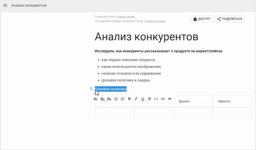 В «Документах» Kaiten стало проще работать командам. Первое из нововведений — упоминания пользователей. Достаточно оставить комментарий в нужном фрагменте текста, ввести символ «@» и выбрать коллегу из списка — он получит уведомление и сразу увидит, какой фрагмент текста нужно прокомментировать. Это снижает количество дополнительных уточнений о том, где именно необходима правка или согласование. Одновременно с этим в «Документах» появились колонки. Они позволяют разбивать информацию на две-четыре части. В колонках можно сравнивать варианты, например, «было» и «стало», составлять дорожные карты по кварталам, делать инструкции или структурировать большие документы на логичные блоки. Такой формат облегчает визуальное восприятие текста. Внутри доступно стандартное форматирование: списки, изображения и медиа. А чтобы упростить навигацию по объемным файлам, можно добавить оглавление. Теперь оно автоматически формируется из заголовков документа и обновляется вместе с ним.
