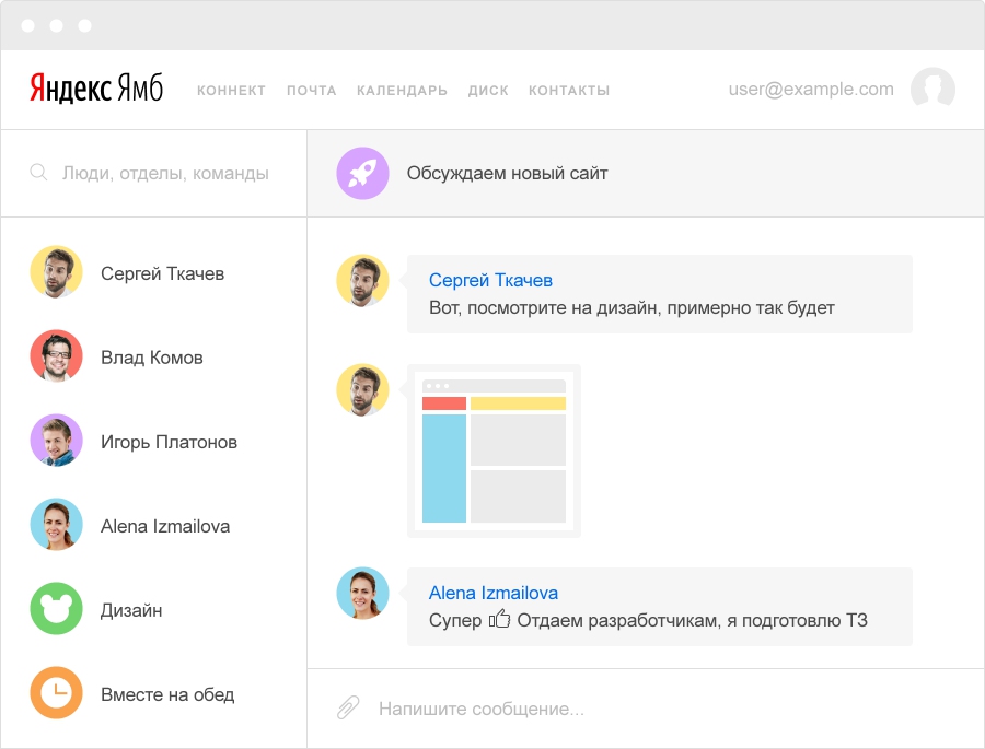 Мессенджер для рабочего общения, простой и безопасный. Позволяет создавать группы для совместной работы. Мобильная версия. Интеграция с другими сервисами Яндекса